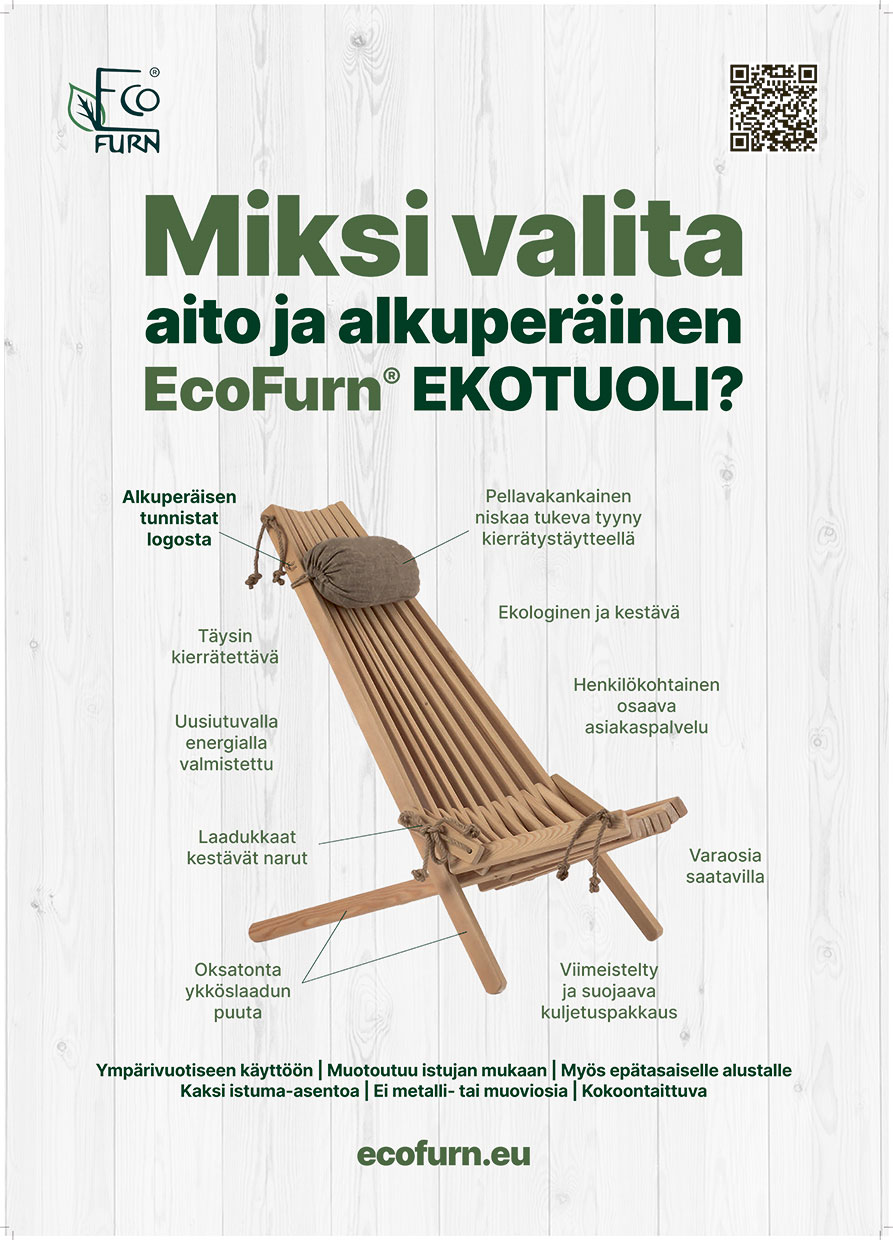 EcoFurn Ekotuoli on valmistettu käyttäen ainoastaan luonnollisia materiaaleja, puuta ja hamppuköyttä. Ekologinen tuoli on erinomainen valinta niin sisälle kuin puutarhaankin. Käsittelemätön tervaleppä soveltuu sisäkäyttöön, mutta se voidaan käsitellä myöhemmin, jolloin siitä saadaan näppärä puutarhatuoli. Köyden ansiosta tuoli ei keiku epätasaisellakaan alustalla, ja paino jakautuu tasaisesti. Ekotuoli tarjoaa ainutlaatuisen ja erittäin mukavan istuimen.