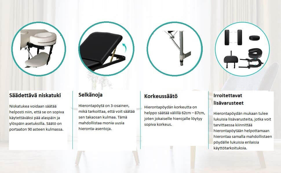 Hierontapöydän kolme erillistä vyöhykettä mahdollistavat laajemman hoitoalueen ja ergonomisemmat työasennot, erityisesti kun asiakkaan selkänojan tai jalkojen asento vaatii säätöä. Pöytä sopii täydellisesti erilaisiin hoitomuotoihin ja hierontatekniikoihin. Korkeudensäätö (62–87 cm) ja portaattomasti säädettävä päätuki antavat lisää joustavuutta jokaisen asiakaskohtaamisen aikana.