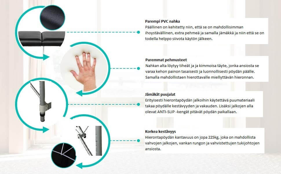 Pöydän pinta on verhoiltu pehmeällä, mutta kulutusta kestävällä PVC-nahalla, joka on helppo puhdistaa hoitokertojen välillä. Paksu 5 cm pehmuste lisää asiakkaan mukavuutta – olipa kyseessä lyhyt käsittely tai pidempi hoitojakso. Irrotettavat käsituet ja niskatuki viimeistelevät asiakaskokemuksen.