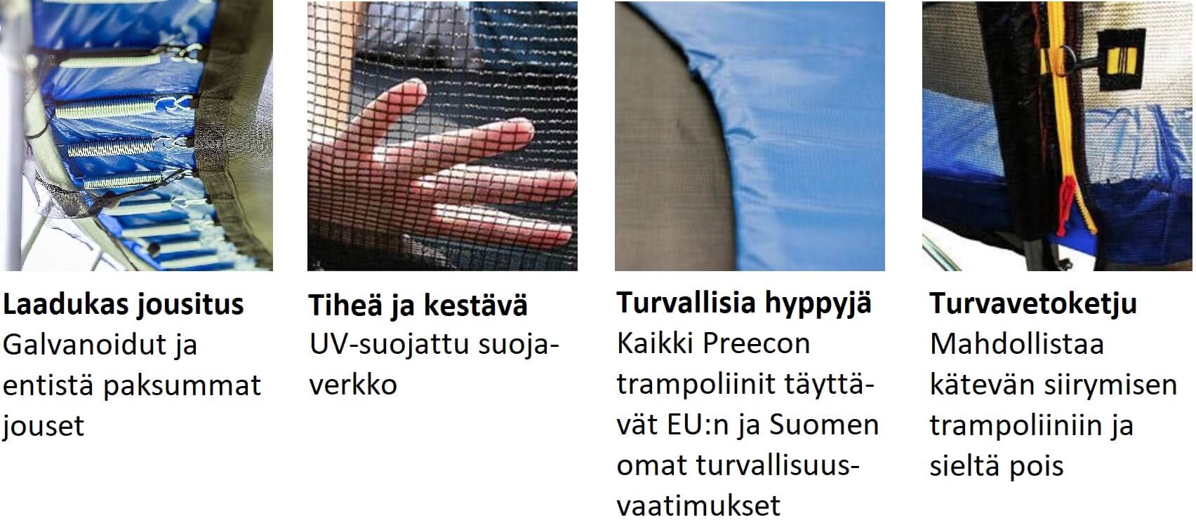 Trampoliini on suunniteltu niin, että sen kokoaminen onnistuu jopa alle tunnissa mukana tulevien suomenkielisten ohjeiden avulla. Et tarvitse kasaamiseen erikoistyökaluja, ja kaikki tarvittavat osat toimitetaan samassa paketissa. Preecon kasauspalvelulla voit halutessasi ulkoistaa kokoamisen täysin.